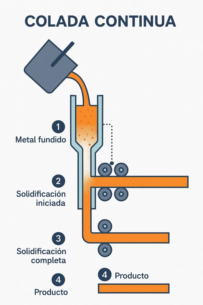 La colada continua es un proceso de fundición en el que el metal fundido se vierte de manera continua en un molde refrigerado, solidificándose progresivamente a medida que avanza. Este método permite obtener productos semiacabados como barras, tubos, placas y perfiles con una estructura interna homogénea y libre de porosidades.